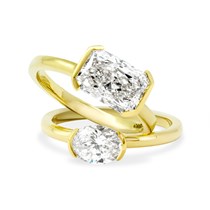 Here's an example of a popular Oval Cut East West diamond engagement ring pictured with a Radiant Cut East West Solitaire, both in 18ct yellow gold, from 2025: